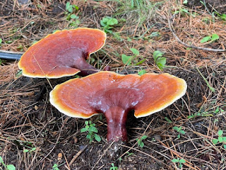 紫靈芝: 紫靈芝菌帽和菌莖為黑色皮,鏽褐色菌,菌管堅硬,菌體顏色相同,菌管口圓,每平方毫米約5個。